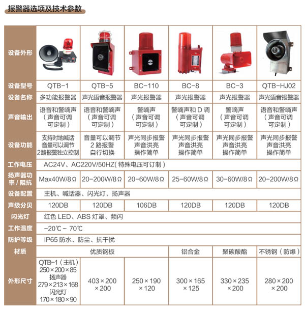 报警器系列产品是LED闪光灯和扩音喇叭同时示警的设备,具有高亮度闪光、响亮音频报警功能,广泛用于冶金钢铁、港口码头、化工、电力、煤矿矿山、工程机械、桥梁隧道等行业设备及场所,我公司致力于智能声光报警设备的研发与制造,采用先进的声光控制技术内置语音IC芯片,满足不同领域的需求,产品具有重量轻、防水、防尘。抗震、抗干扰、使用简单等优点,针对不同生产场所环境和设备开发的系列产品有:多功能起吊报警器、声光报警器、语音声光报警器、防爆报警器、电子蜂鸣器等
